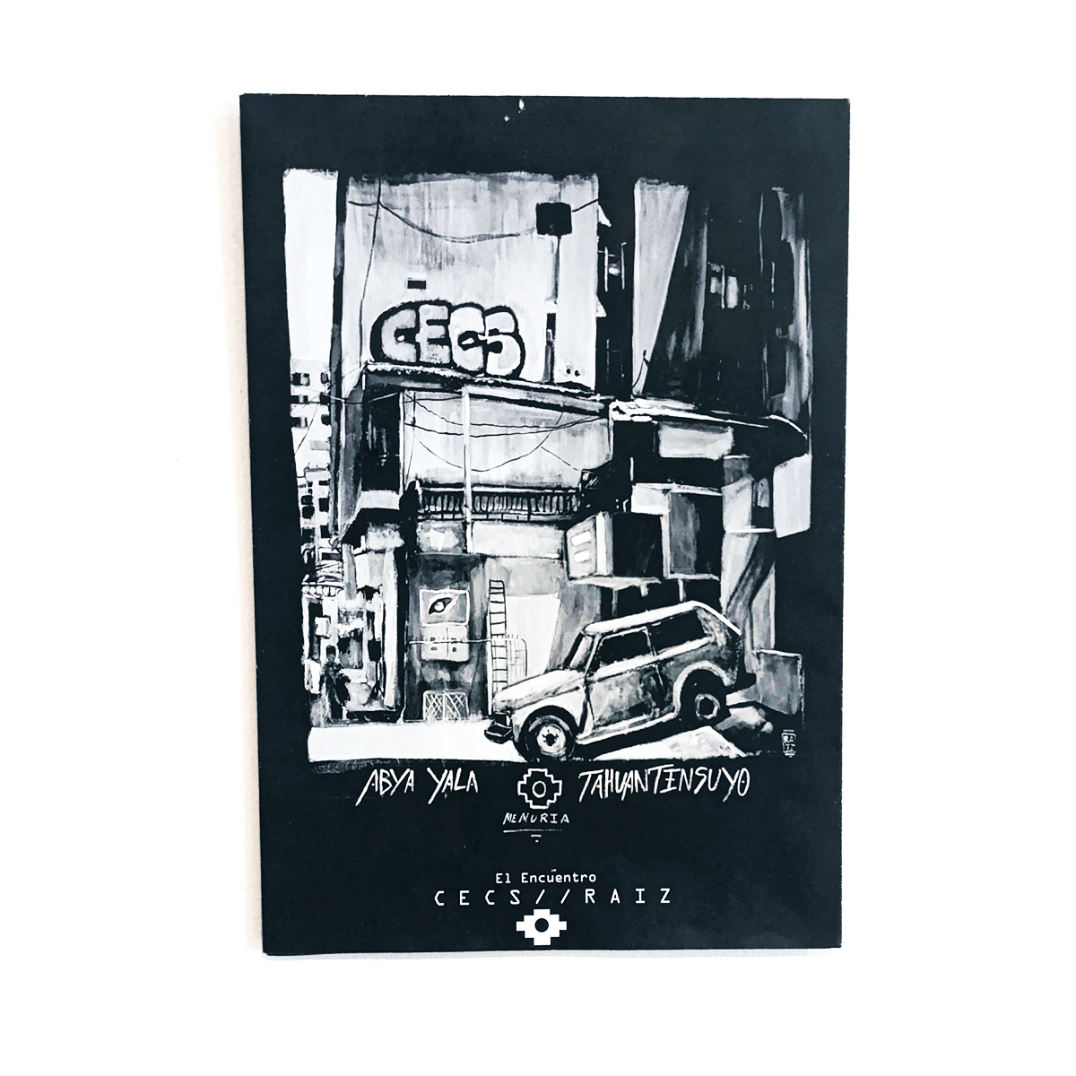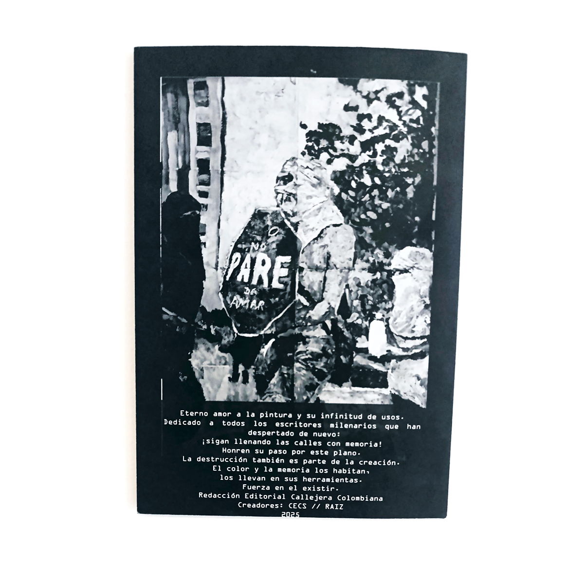Este Fanzine físico reúne las acciones del escritor de graffiti CECS y la visión desde lo espiritual del muralista RAIZ. El texto-es un junte de visones , la Chakana andina y el pulso urbano del graffiti para celebrar la memoria colectiva: de la selva y sus códigos milenarios hasta los callejones actuales donde el graffiti se vuelve ritual. La pieza invita a honrar la tierra, las calles y los cielos, recordando que la creación —aun desde la destrucción— es un acto de amor y resistencia. Impreso en papel bond de 90 g, se convierte en un afiche gigante de 50x70